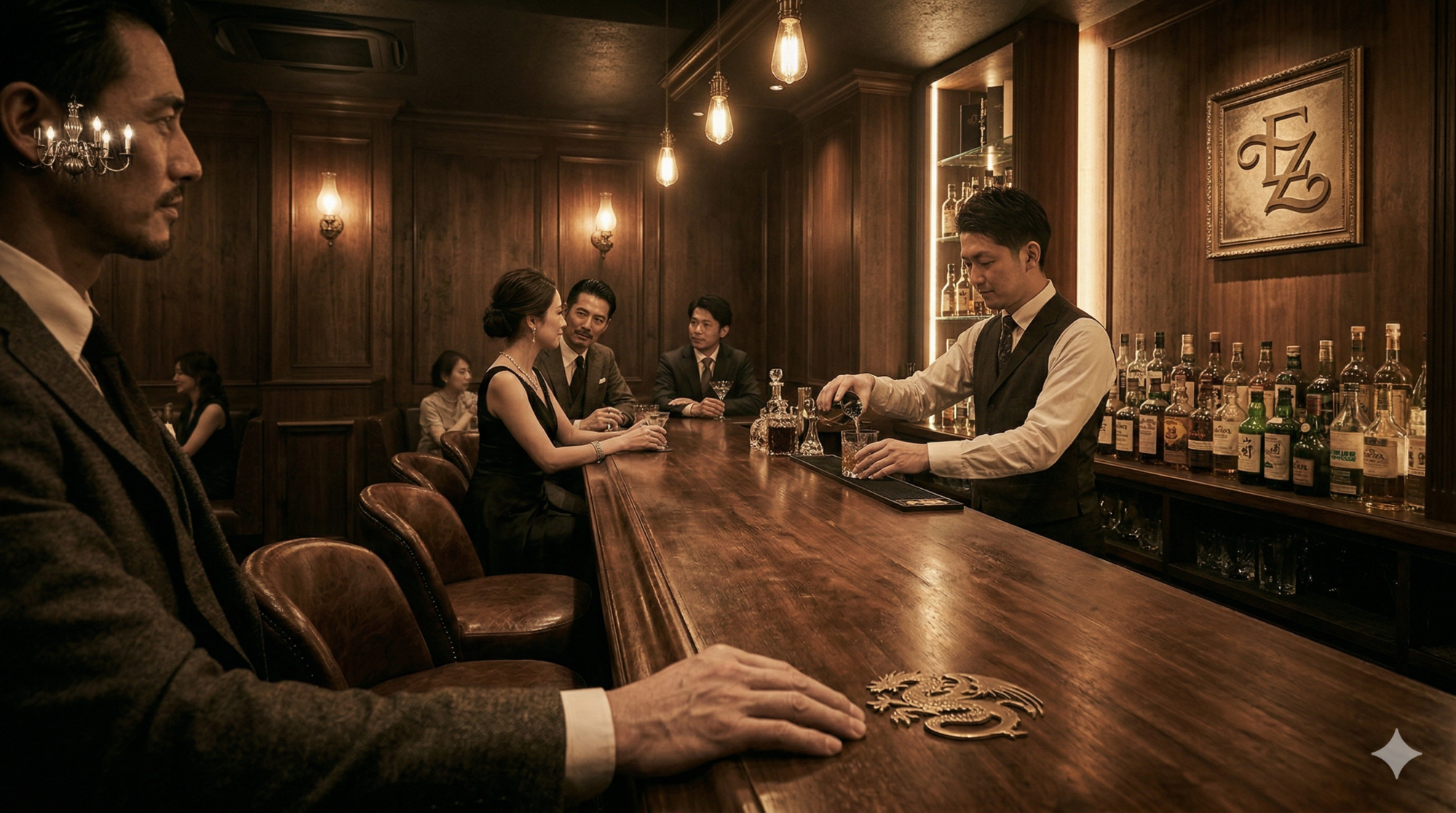 店内に一歩足を踏み入れれば、そこにはオーセンティックなヴィンテージ・バーを彷彿とさせる静謐な趣が広がっています。柔らかく、しかし意思を持って灯るアンバーの光。指先に馴染むベルベットの感触。そして、微かに漂う上質な葉巻とシングルモルトの香り。 この「安心感」と「背徳感」の絶妙なバランスこそが、ESZの真骨頂です。初めて訪れる方が抱く「どこかで体験したことがあるような、心地よい既視感」は、私たちが本来持っている「人との繋がりの原風景」を、ESZが完璧に再現しているからに他なりません。